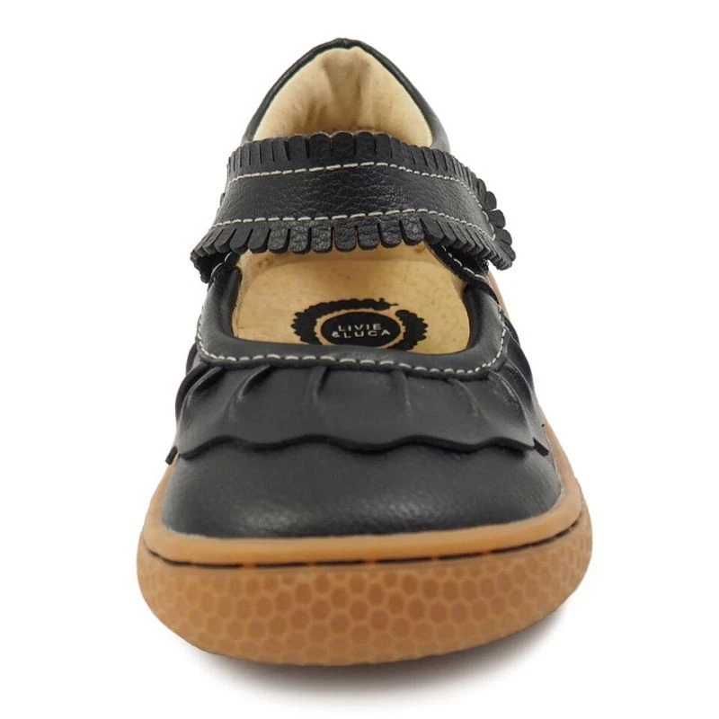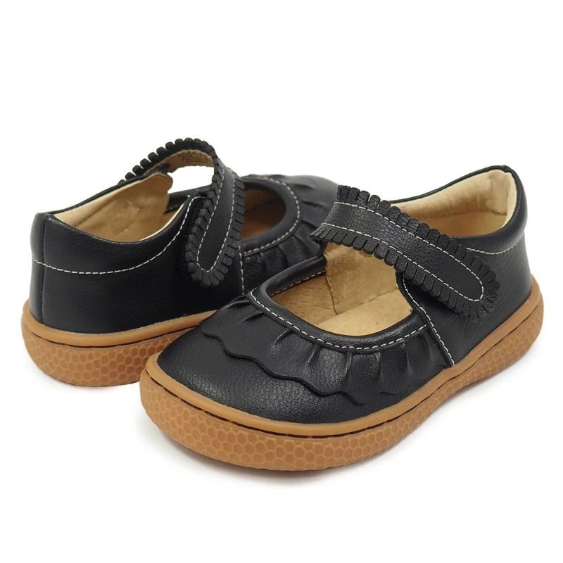 Pretty and stylish Ruche is a great everyday shoe now available in a black and perfect for school use. It has just a few kisses of detail – a scalloped strap and scalloped applique; ruffles over the front and heel.