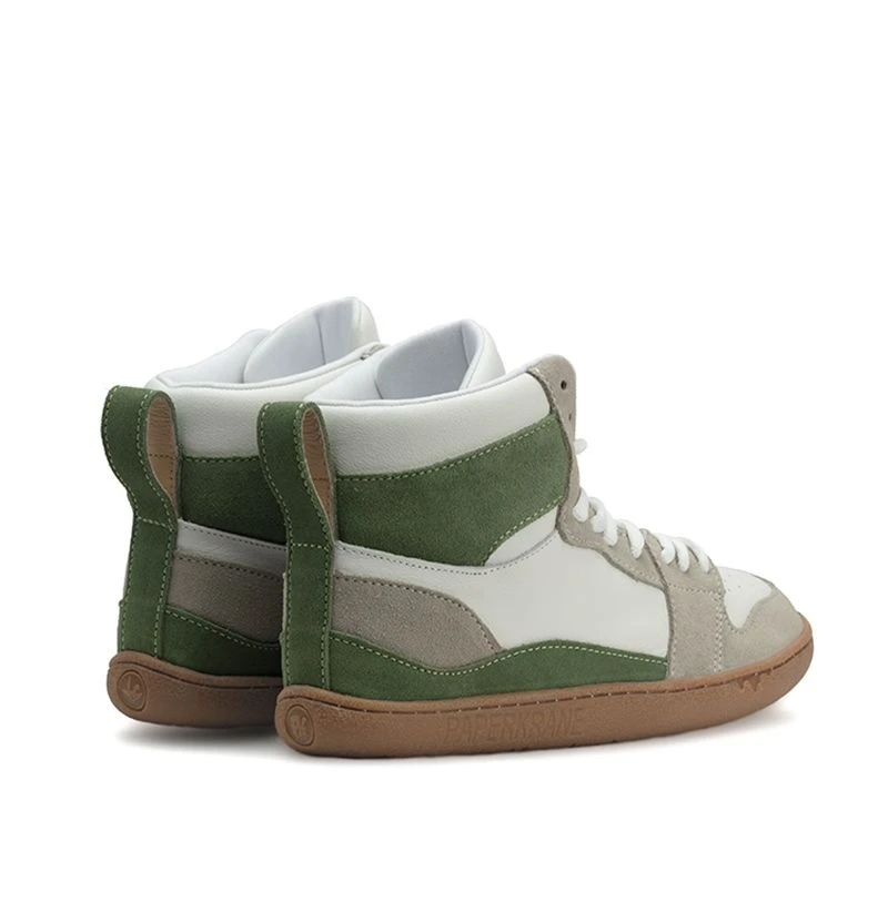 Now the adults can get chance to try PaperKrane with these classic high top boots. They have the same zero drop 4mm thin sole as the kids versions, made of flexible natural rubber which is stitched for extra durability. A soft white leather upper with suede panels and a sports knit lining in a classic lace up design for everyday comfort.