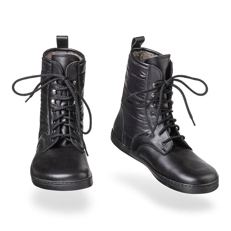 | Features | High quality leather and quilted fabric upper. Warm Wool Lining. Thermoplastic rubber sole. Zero drop. Wide toe box. Thin and flexible sole which is both glued and sewn on for maximum durability. Lace up style with hooks to top 3 fasteners. Sole thickness is 3.5mm with a 1.5mm lug to give a stack height of 5mm. |